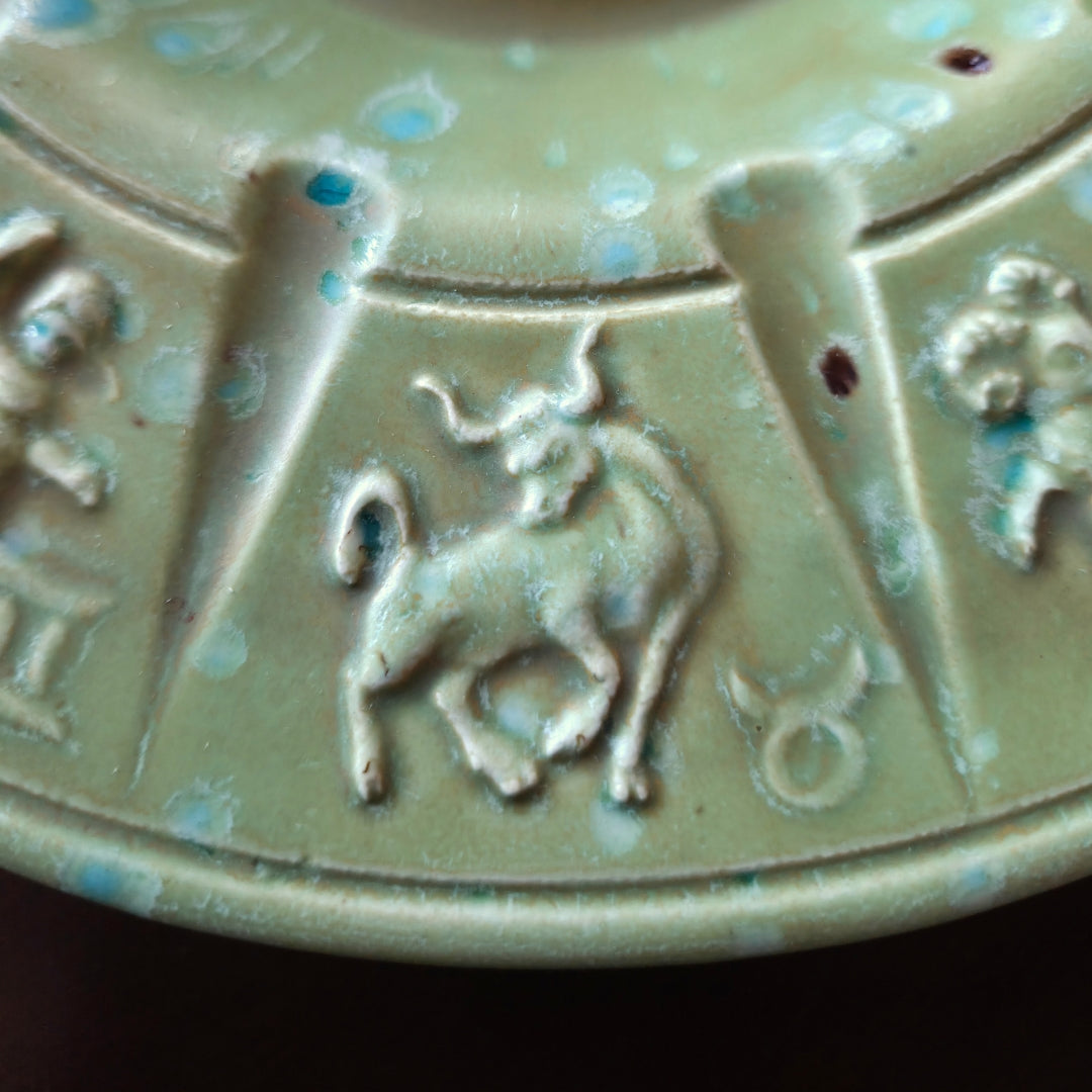 - Design: A real showstopper. A soft avocado glaze scattered with turquoise and brown speckles, giving it the look of true studio pottery. The heaviest of the three, with the crispest and most defined astrological symbols. 1970 date inscription on bottom.