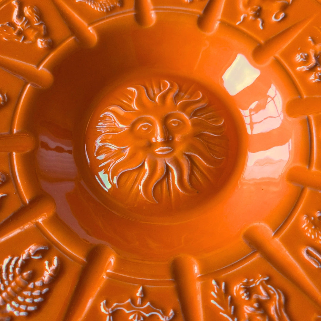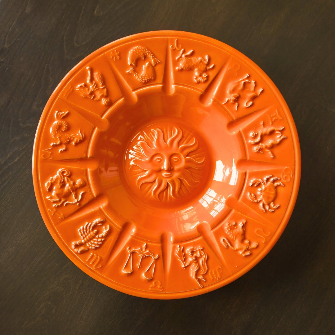 A mid-century ceramic bowl molded with the twelve zodiac signs encircling a radiant sun. Heavy, dramatic, and full of presence, it works beautifully as an oversized ashtray with the grooves between each sign doubling as cigarette rests, a ritual dish, or a striking catch-all for keys, jewelry, herbs, or ritual tools. However you use it, it’s the kind of object that instantly becomes the focal point of a room. Set on a table, hang it on a wall, or place it on your altar.